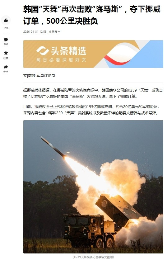동유럽의 에스토니아부터 북유럽의 노르웨이까지, 한국의 천무 로켓포 시스템이 미국의 하이마스를 연달아 제치고 유럽 군수 시장의 문을 성공적으로 두드린 것은 결코 우연이 아니다.