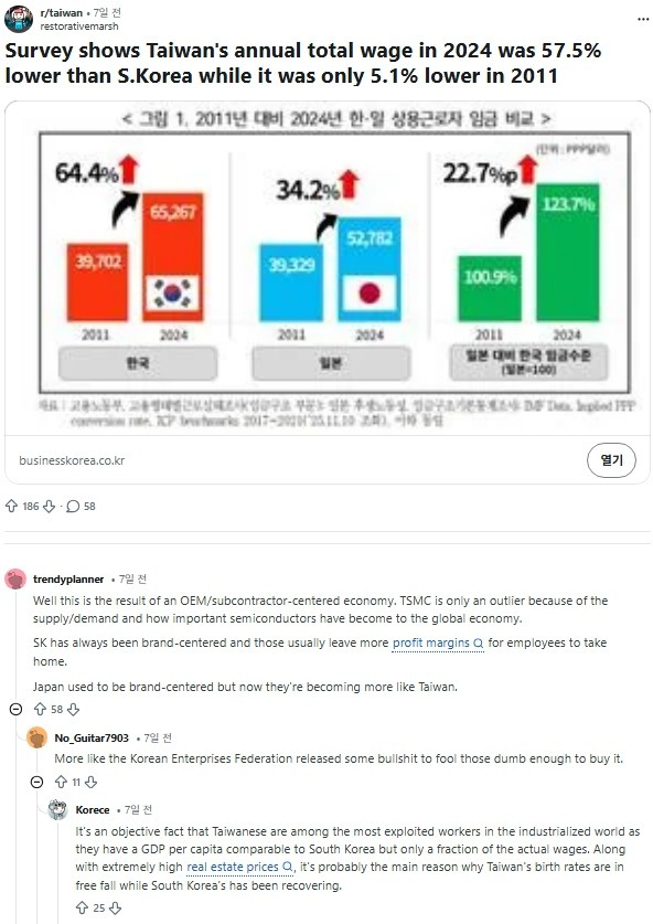 2011년에는 한국의 임금이 대만보다 5.1% 높은 수준이었으나, 이후 한국의 임금이 70.8% 상승하는 동안 대만은 54.4% 상승에 그치며 그 격차가 크게 벌어졌다.