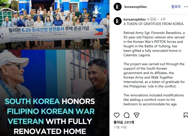 6.25 전쟁에 필리핀 PEFTOK 부대 소속으로 참전하여 율동 전투에서 싸웠던 93세의 필리핀 참전용사, 예비역 육군 상사 플로렌도 베네딕토(Florendo Benedicto) 씨가 라구나주 칼람바에 있는 자신의 집을 전면 개조하여 선물 받았습니다.